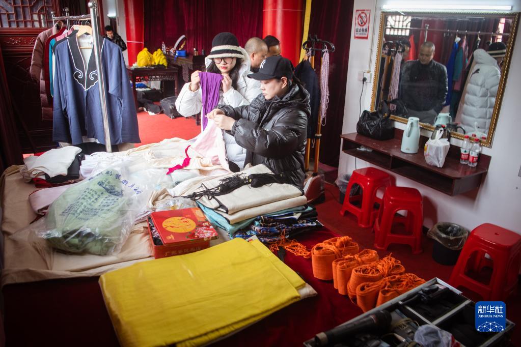 2月3日,武漢楚劇院演員在后臺準備服裝。