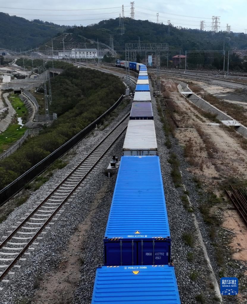 2月3日,中歐班列駛出興泉鐵路黃塘站(無(wú)人機照片)。