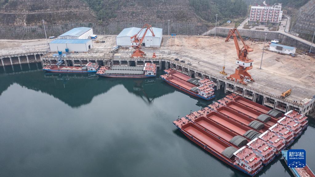 2月3日,貨船在余慶縣沙灣碼頭裝載貨物(無(wú)人機照片)。