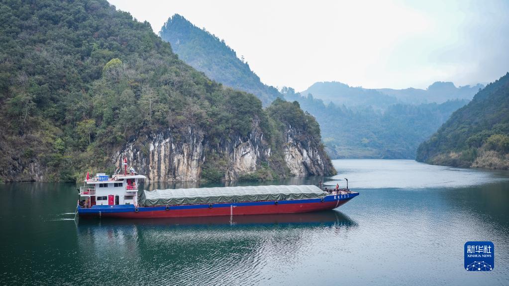 2月3日,貨船從余慶縣沙灣碼頭駛出(無(wú)人機照片)。