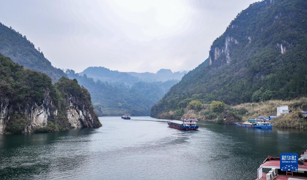 2月3日,貨船從余慶縣沙灣碼頭駛出(無(wú)人機照片)。