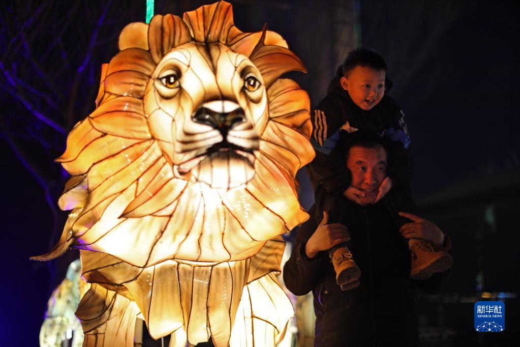 2月3日,一位小朋友和家長(cháng)在營(yíng)口遼河老街的獅子花燈前拍照留念。