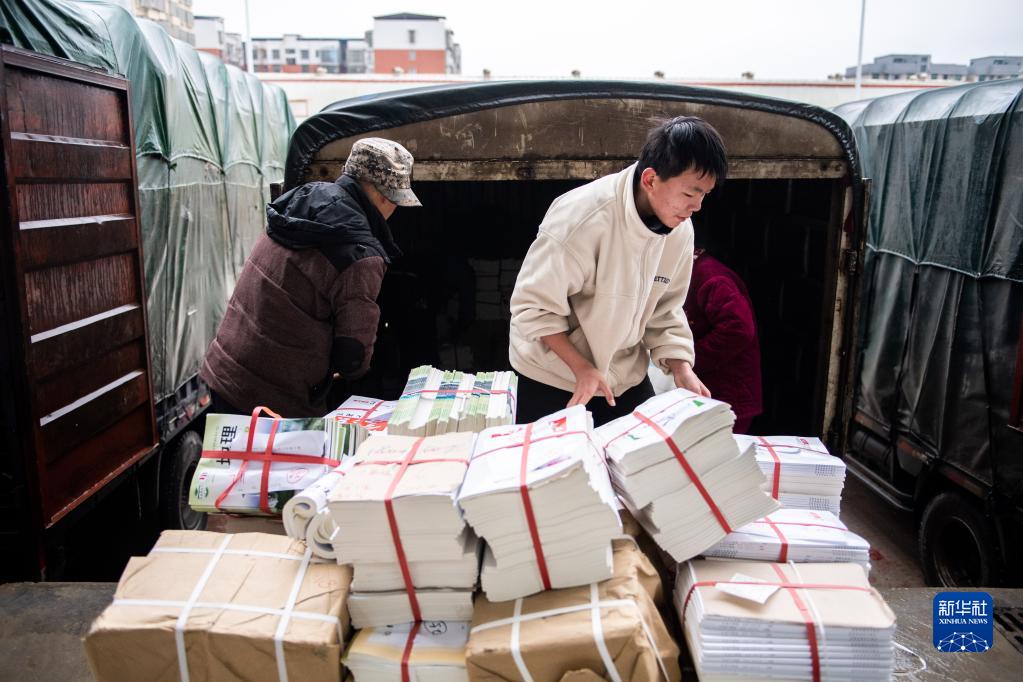 2月4日,工作人員在祁陽(yáng)市新華書(shū)店教材中轉庫搬運教材。