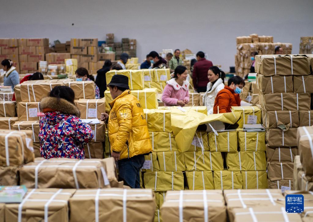 2月4日,在祁陽(yáng)市新華書(shū)店教材中轉庫,工作人員在分發(fā)教材。