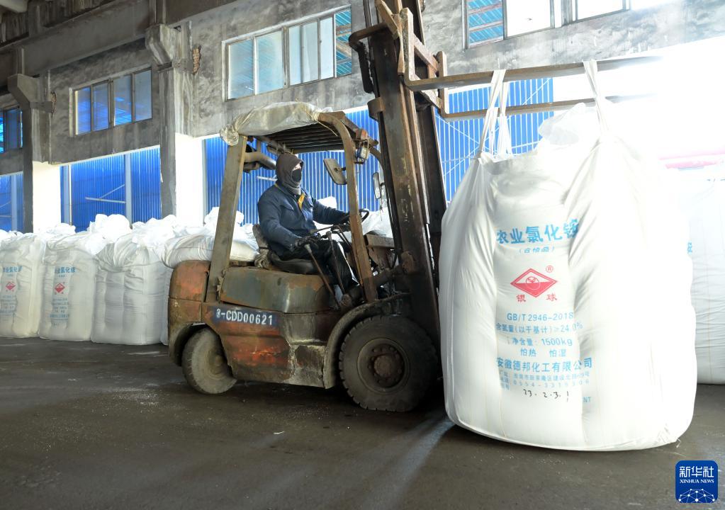 2月3日,在淮南市一家化工有限公司,工人駕駛叉車(chē)搬運化肥。