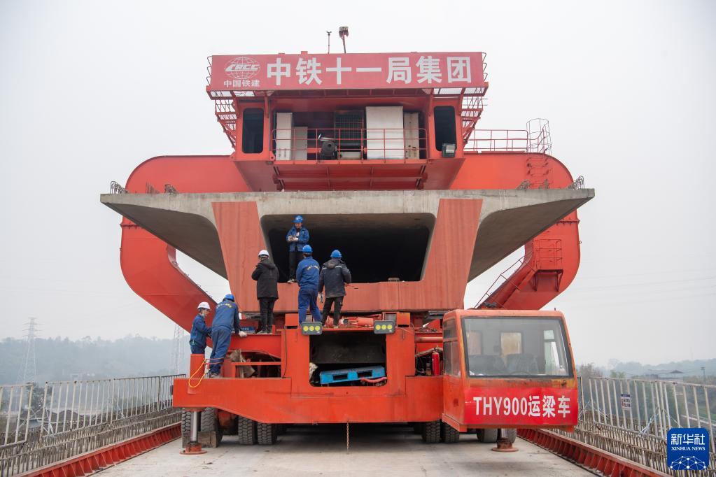 2月4日,在渝昆高鐵重慶段建設施工現場(chǎng),架橋機在進(jìn)行830噸大型箱梁架設作業(yè)。
