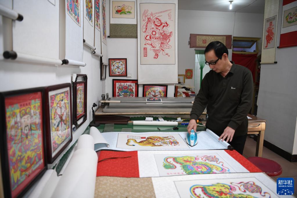 2月3日,河北省武強縣一家年畫(huà)工坊的工作人員在裝裱年畫(huà)。