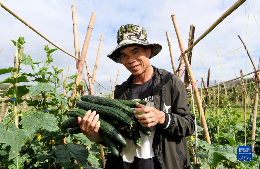 海南省三亞市育才生態(tài)區那受村農戶(hù)董政強展示剛采摘的青瓜(2月2日攝)。