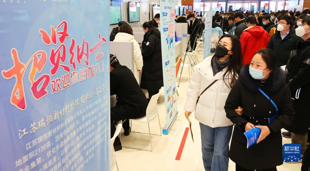 2月4日,在江蘇連云港市人力資源市場(chǎng),求職者在了解崗位招聘情況。連云港市舉辦“留連望返·就在港城”2023年春季人才交流大會(huì ),150余家用人單位提供6500余個(gè)工作崗位。