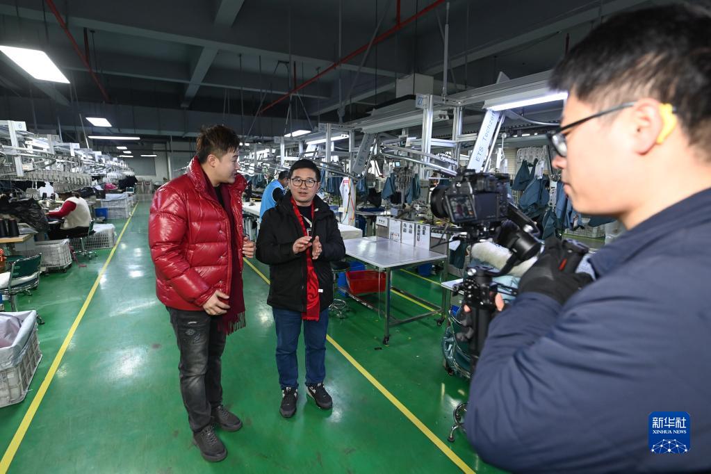 2月4日,在義烏市蘇溪鎮棒杰數碼針織品有限公司車(chē)間,企業(yè)負責人(左二)通過(guò)線(xiàn)上直播介紹企業(yè)情況及用工需求。
