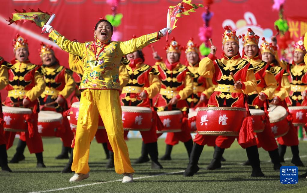 2月4日,陜西省渭南市合陽(yáng)縣體育場(chǎng)內,居民進(jìn)行鑼鼓展演。