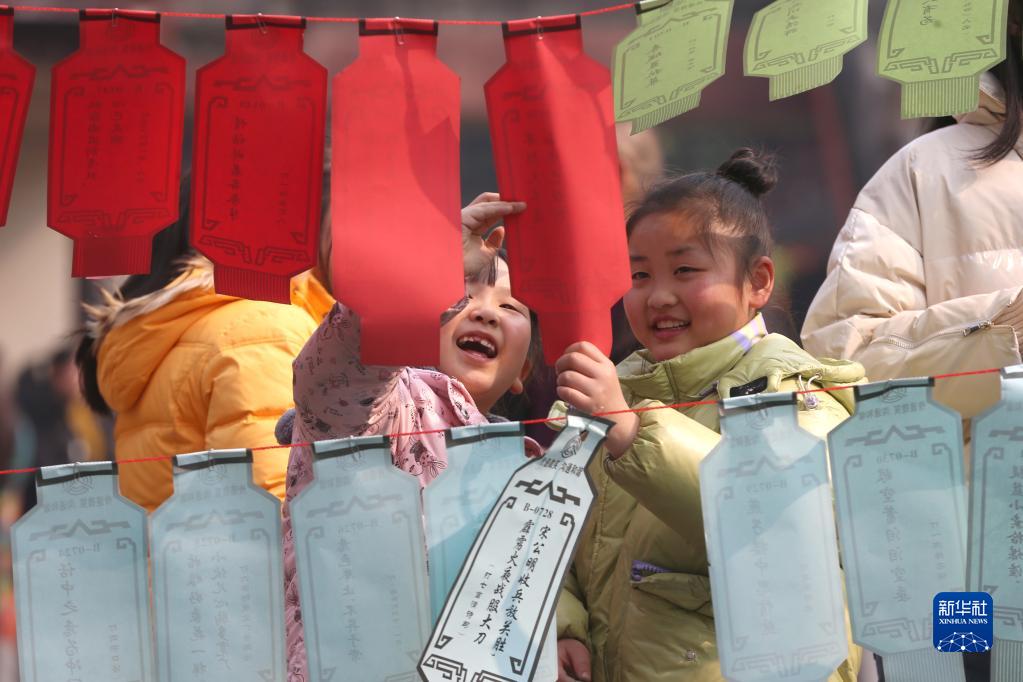 2月3日,在四川省眉山市東坡區三蘇祠前的啟賢廣場(chǎng),小朋友在猜謎語(yǔ)。