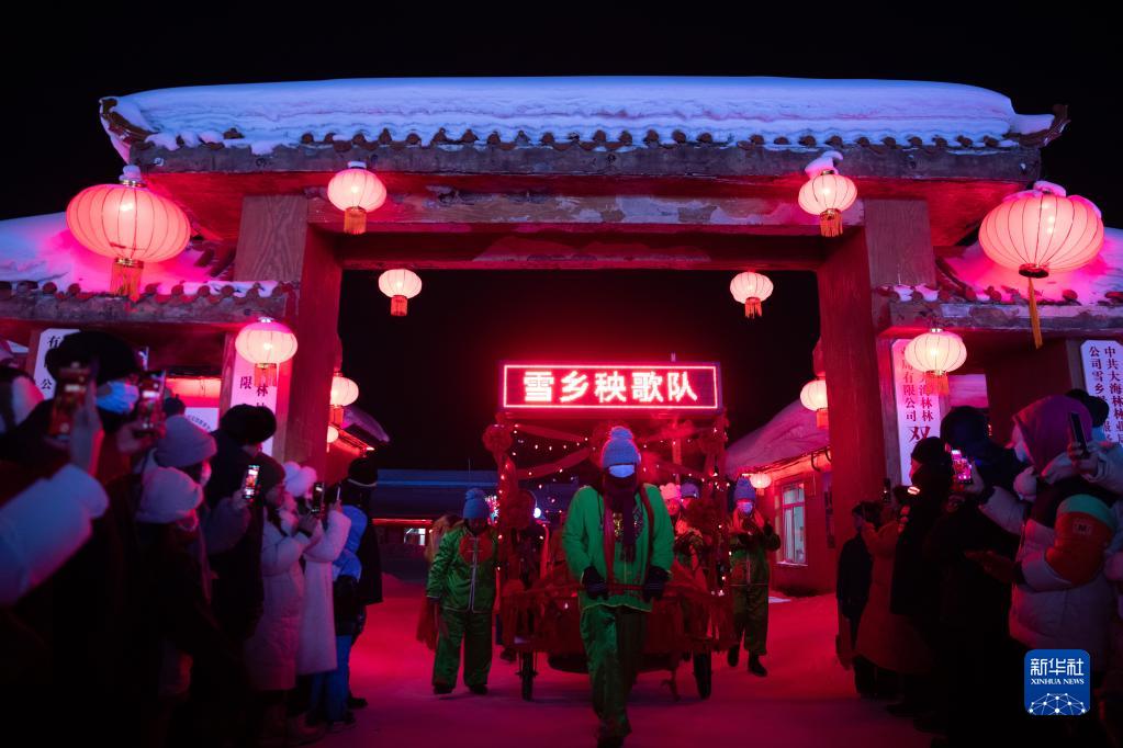 2月4日,秧歌隊在位于黑龍江省牡丹江市的大海林林業(yè)局有限公司雙峰林場(chǎng)雪鄉景區內表演。