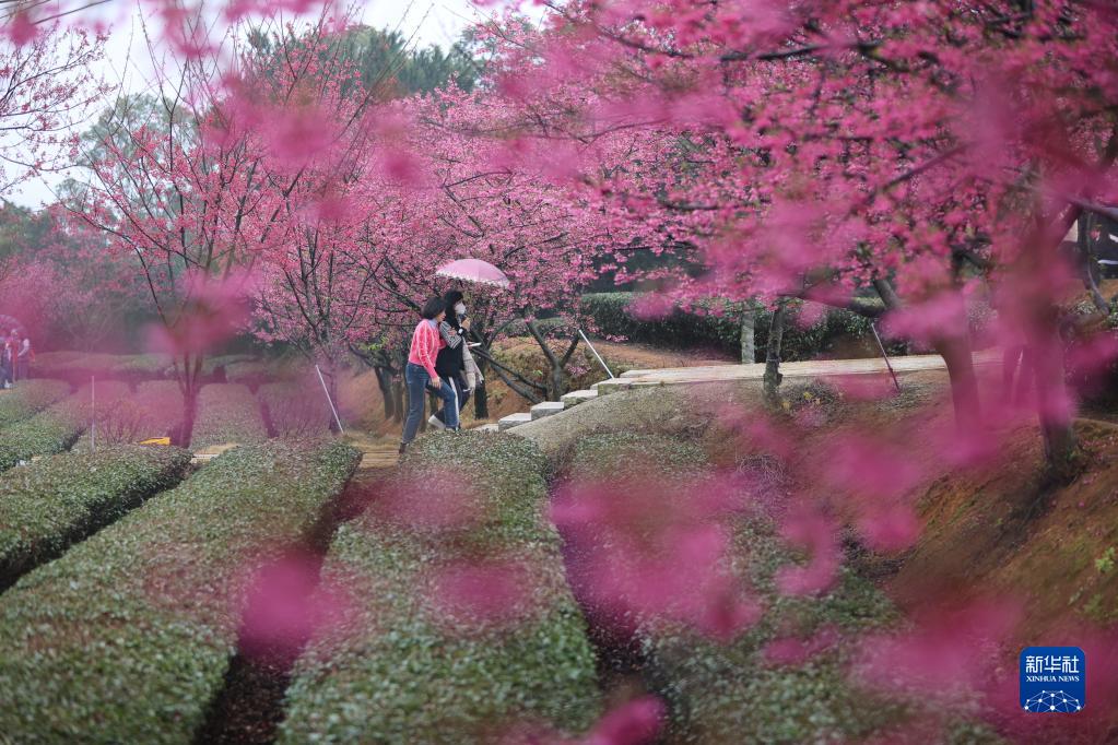 2月4日,在廈門(mén)市翔安區妙高山一處生態(tài)茶園,游人在觀(guān)賞櫻花。