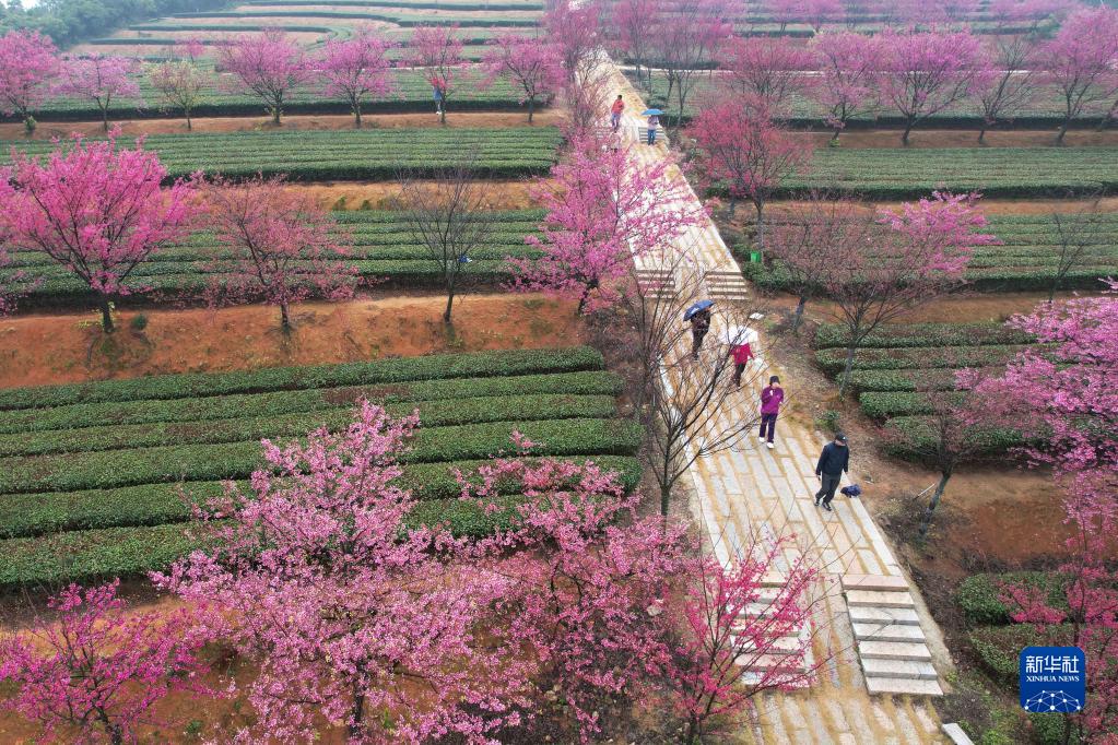 立春時(shí)節,福建省廈門(mén)市翔安區妙高山種植的櫻花在生態(tài)茶園里競相綻放,美不勝收。
