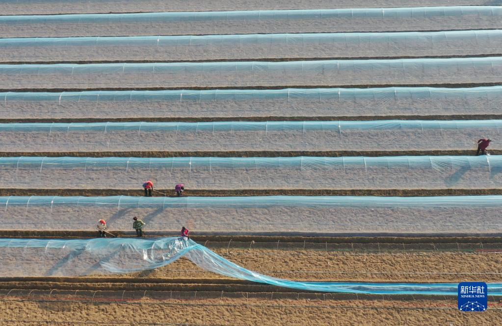 2月4日,農民在河北省石家莊市欒城區小孫村農田里搭建蔬菜拱棚(無(wú)人機照片)。