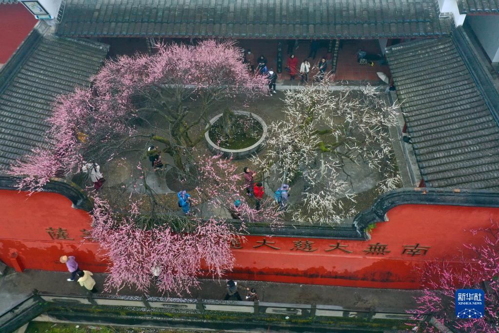 2月4日,游客在福州林陽(yáng)寺游玩賞梅(無(wú)人機照片)。