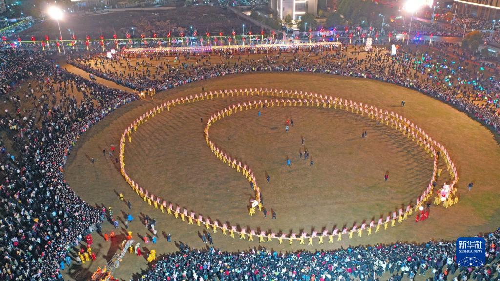 2月4日,在浙江省臺州市仙居縣紅旗廣場(chǎng),仙居縣皤灘鄉村民在表演400余米長(cháng)的板凳龍燈(無(wú)人機照片)。