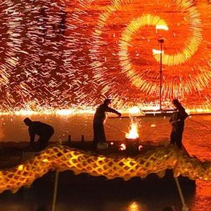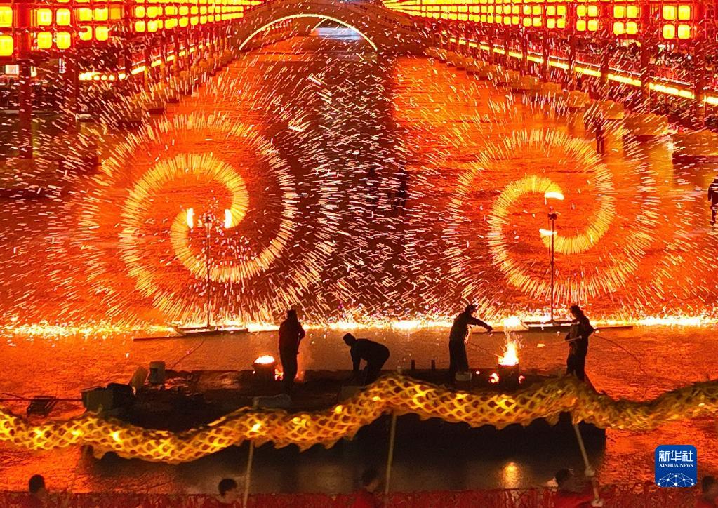 當晚,河北省唐山市豐南區河頭老街景區火樹(shù)銀花,耀眼奪目。民間藝人表演的打鐵花,吸引游客駐足觀(guān)看。