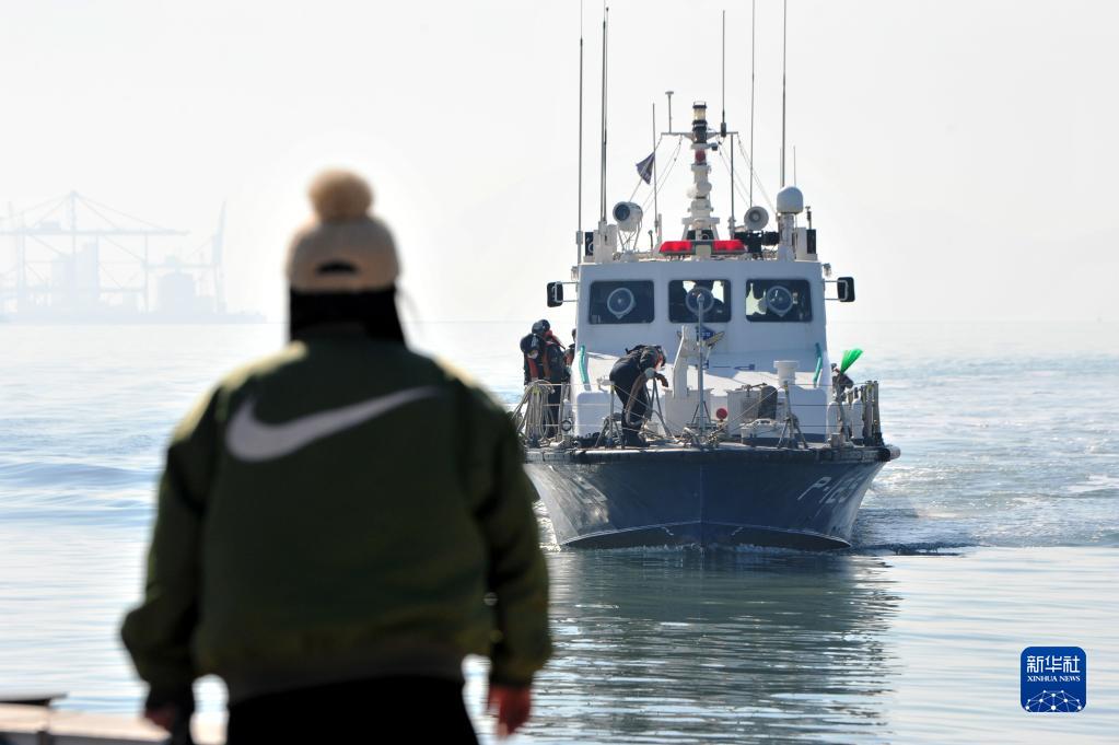 2月5日,載有獲救船員的船只駛入韓國全羅南道木浦市的港口,一名獲救船員的家屬在碼頭等待。