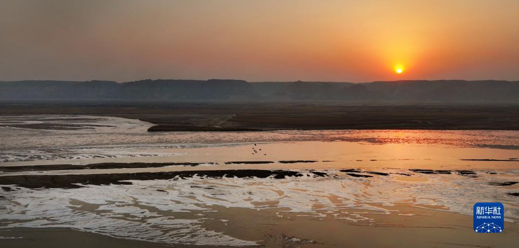 2月3日,黃河西岸的合陽(yáng)黃河濕地自然保護區內,太陽(yáng)緩緩升起(無(wú)人機照片)。