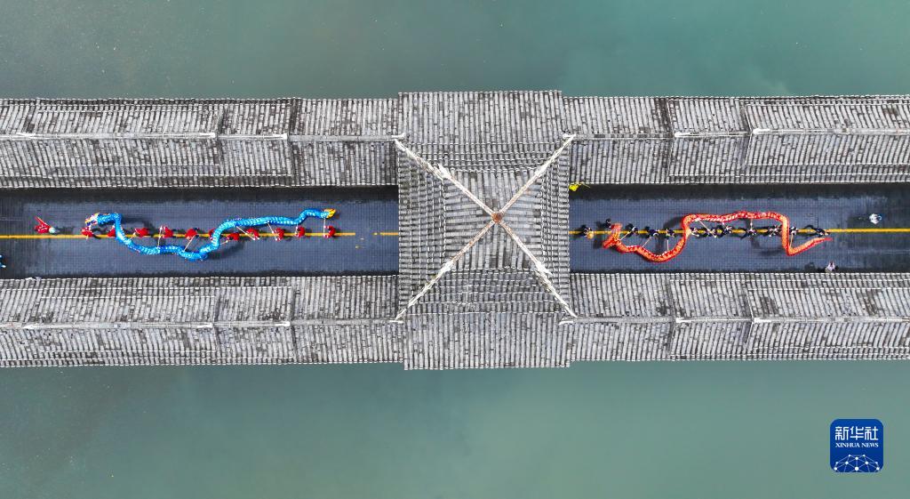 2月5日,在湖南省懷化市新晃侗族自治縣,人們在風(fēng)雨橋上進(jìn)行舞龍表演(無(wú)人機照片)。