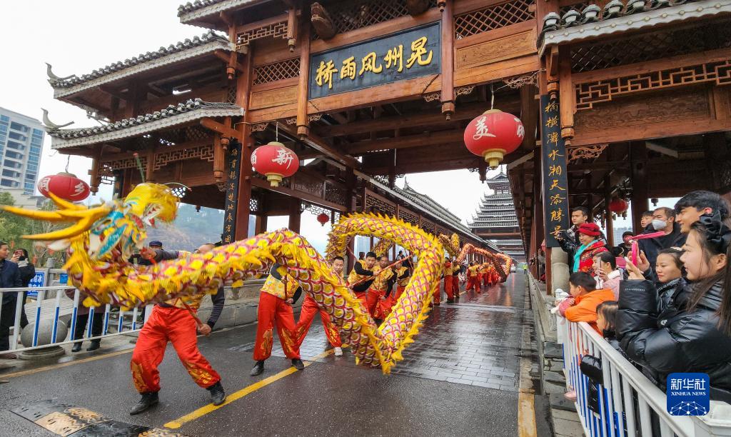 2月5日,在湖南省懷化市新晃侗族自治縣,人們在風(fēng)雨橋上進(jìn)行舞龍表演。