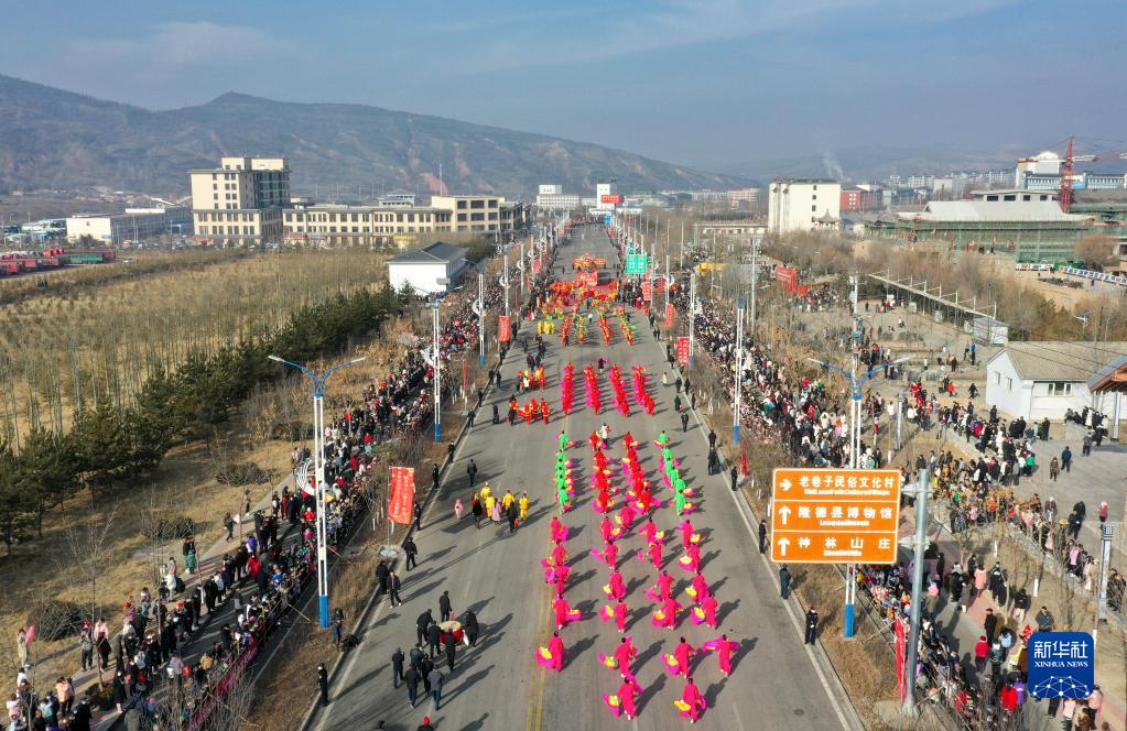 這是寧夏固原市隆德縣舉行的社火展演(2月5日攝,無(wú)人機照片)。