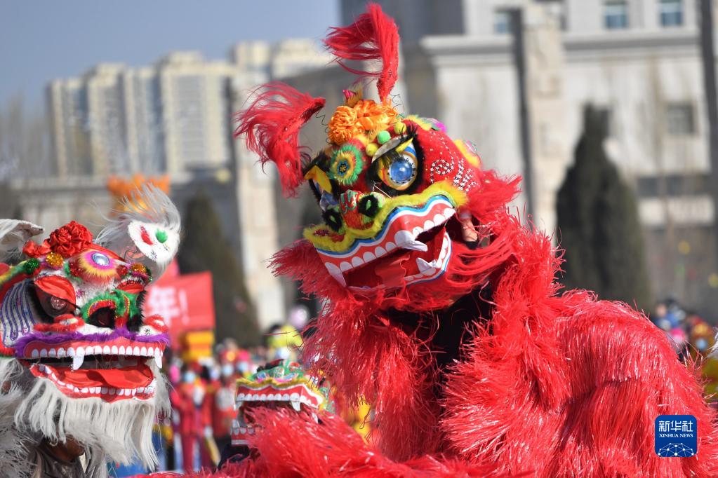 2月5日,在甘肅省白銀市舉辦的社火展演上,民間社火隊的演員進(jìn)行舞獅表演。