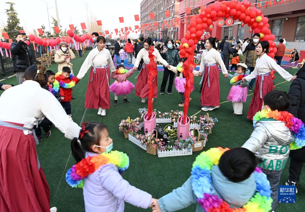 2月5日,河南省焦作市博愛(ài)縣永威幼兒園“元宵廟會(huì )”上,小朋友和老師、家長(cháng)一起做“烤旺火”游戲。