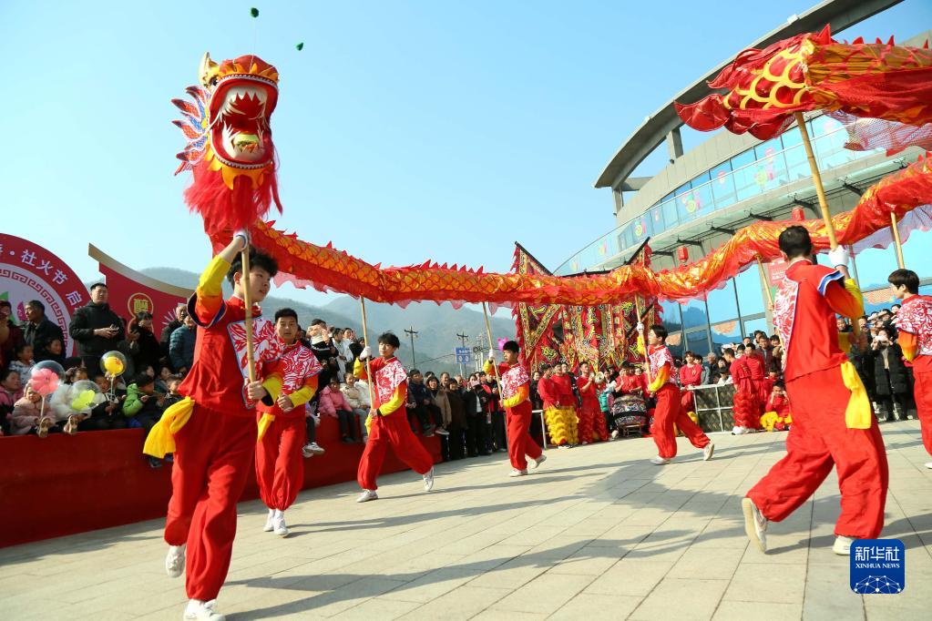 2月5日,河南省洛陽(yáng)市汝陽(yáng)縣付店鎮群眾在街頭龍騰虎躍鬧元宵。