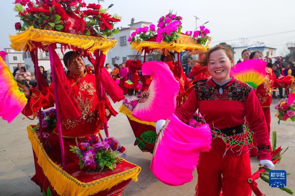 2月5日,河南省信陽(yáng)市光山縣北向店鄉何寨村村民在“劃旱船”。