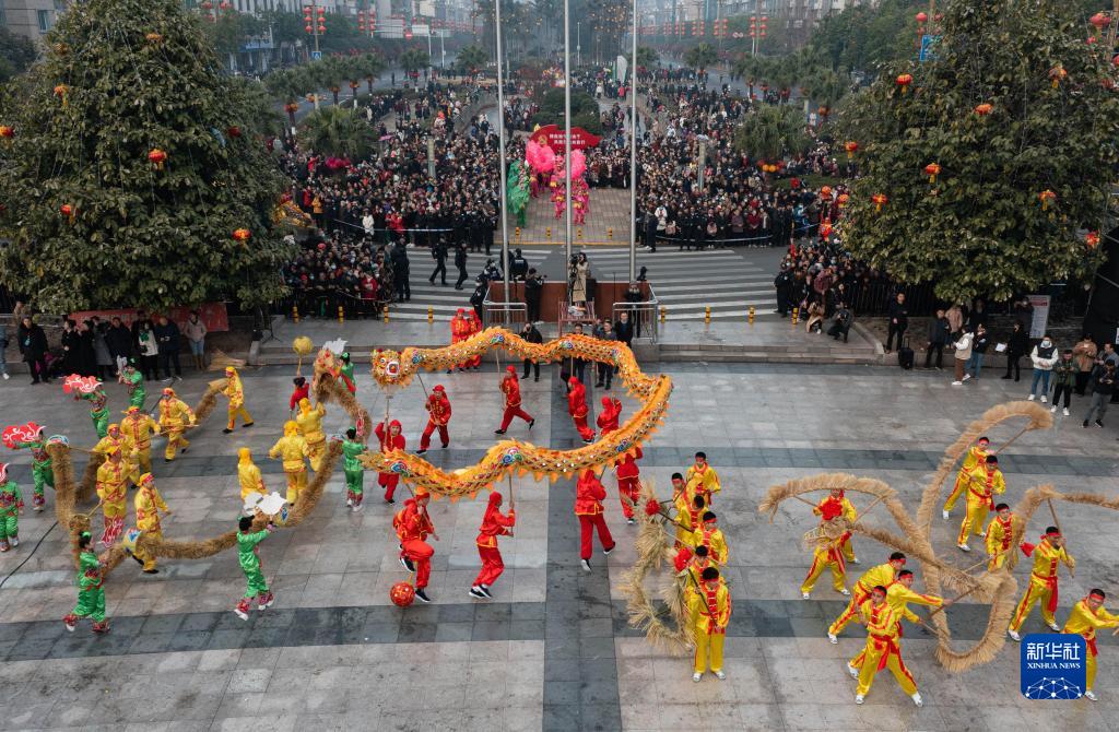 2月5日,四川省瀘縣各鄉鎮的20支龍舞隊伍齊聚縣城人民廣場(chǎng)表演舞龍(無(wú)人機照片)。