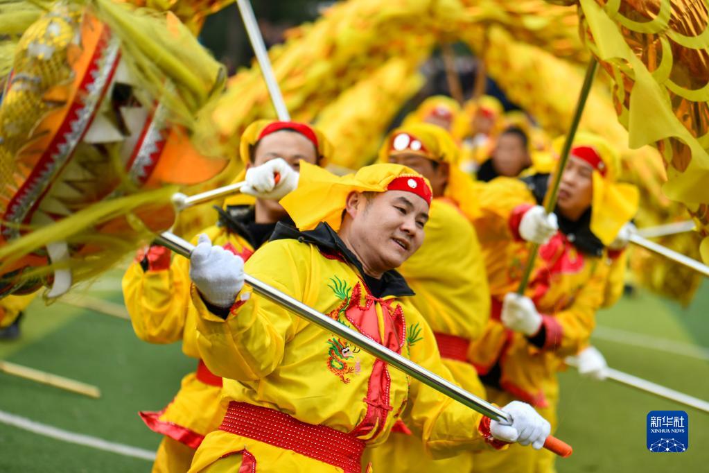 2月5日,村民們在貴州省遵義市湄潭縣黃家壩街道表演舞龍。