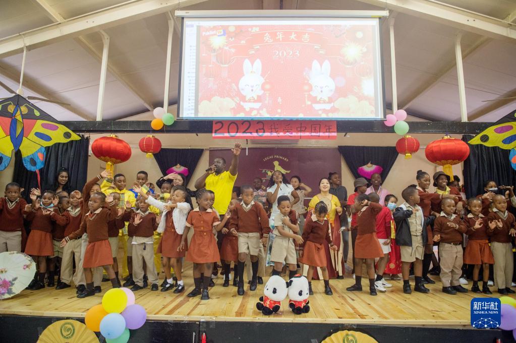 2月3日,在博茨瓦納首都哈博羅內,博茨瓦納大學(xué)孔子學(xué)院在教學(xué)點(diǎn)麗海國際小學(xué)舉辦“我愛(ài)中國年”迎新春活動(dòng)。這是老師和學(xué)生一起表演節目。