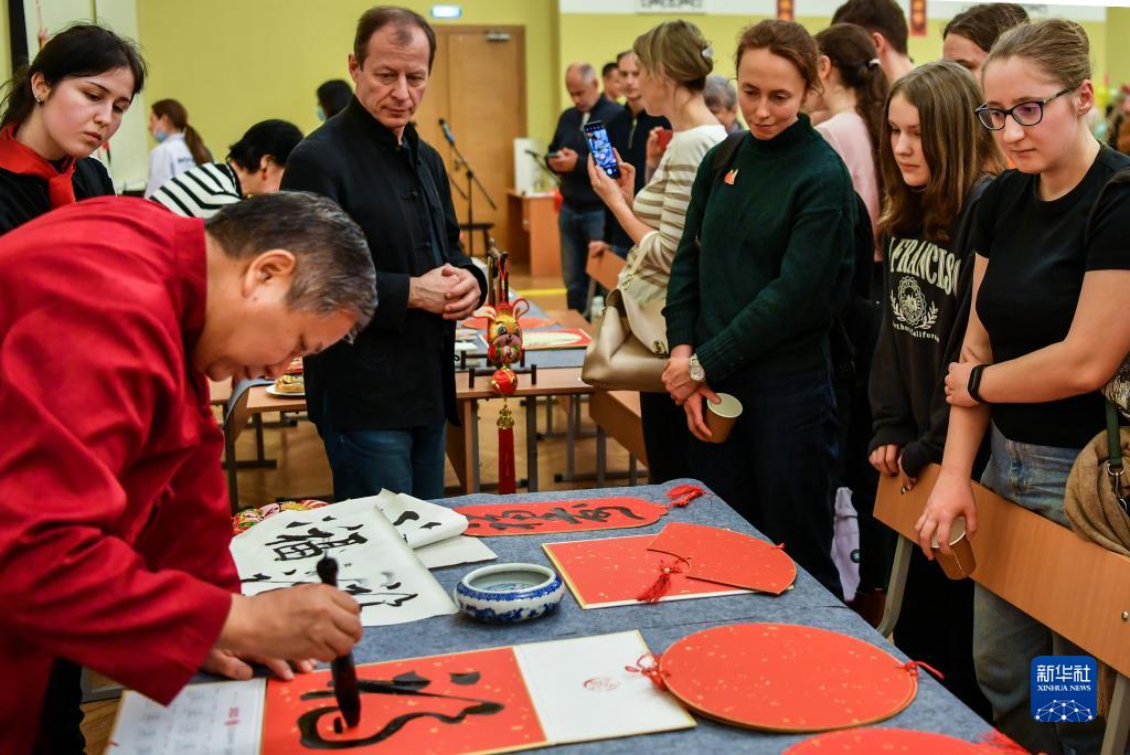 2月3日,在俄羅斯莫斯科國立人文大學(xué)孔子學(xué)院舉行的慶新春晚會(huì )上,人們觀(guān)看書(shū)法家寫(xiě)“?!弊?。