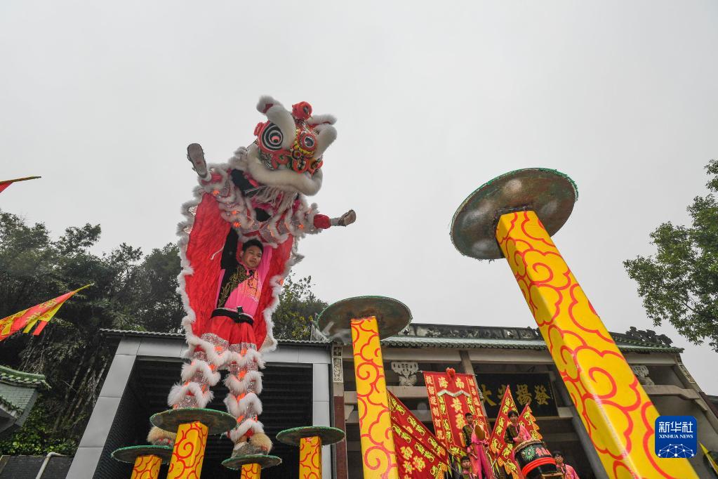 1月12日,在佛山市南海區西樵黃氏宗祠,這里現在也是黃飛鴻獅藝武術(shù)館,獅團為游客表演醒獅。