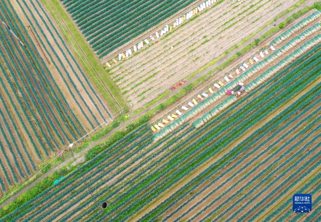 2月4日,村民在漳浦縣六鰲鎮的一處農田里采收大蔥(無(wú)人機照片)。