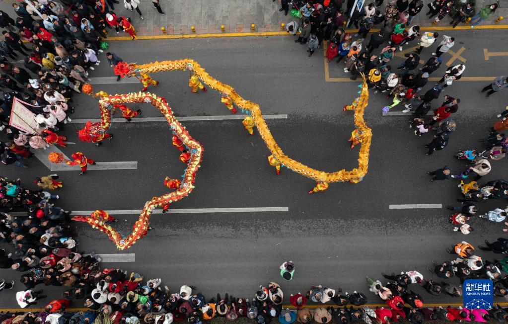 2月5日,居民在四川省瀘縣人民廣場(chǎng)觀(guān)看舞龍表演(無(wú)人機照片)。