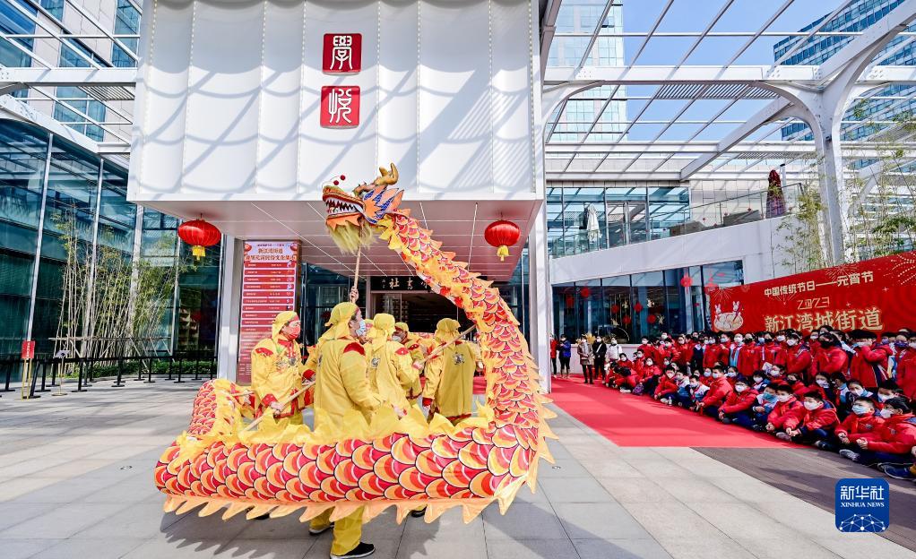 2月5日,藝人在上海市楊浦區新江灣城街道的學(xué)悅風(fēng)詠書(shū)社表演舞龍。