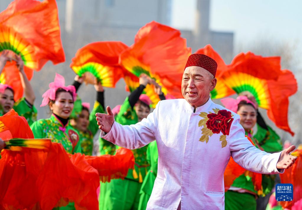 2月5日,在新疆烏魯木齊市米東區人民廣場(chǎng),社火隊員進(jìn)行新疆“花兒”表演。