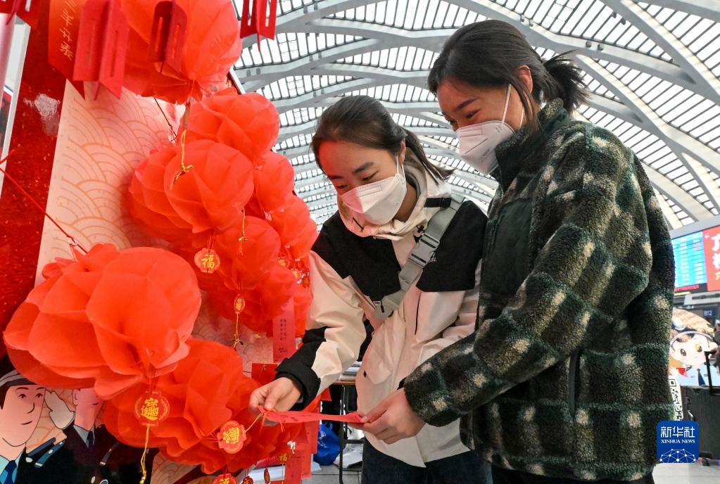 2月5日,在天津西站候車(chē)廳,旅客在猜燈謎。