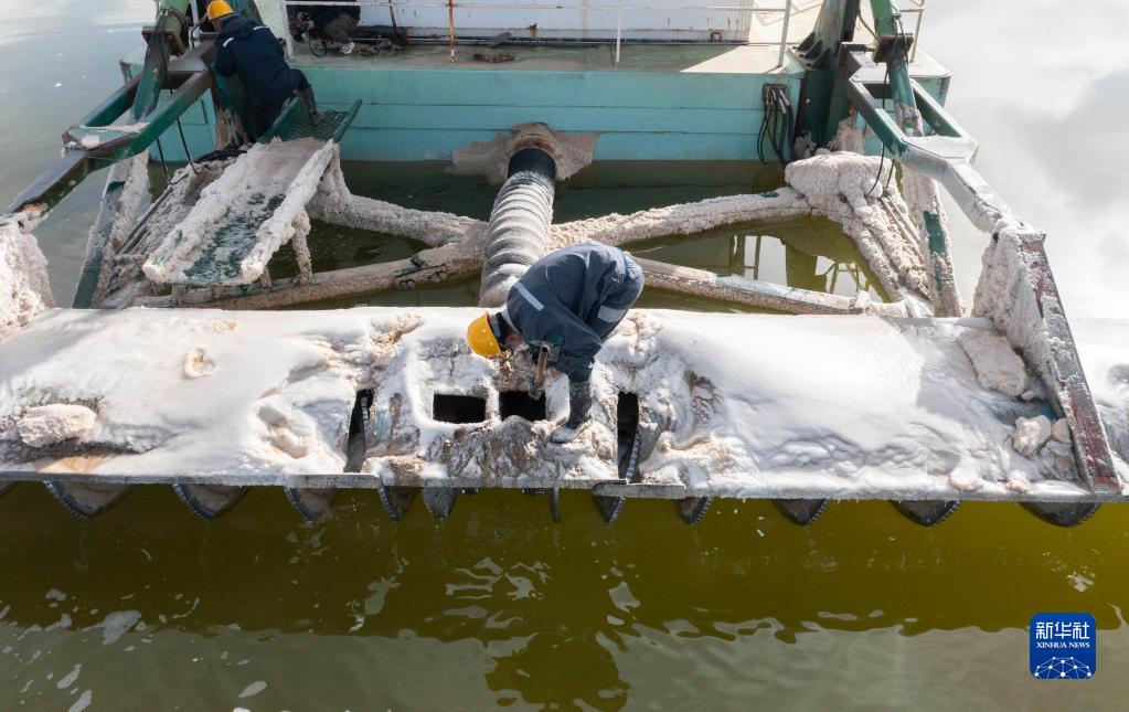 2月2日,賀連福與同事在清除水采船船身上的鹵水結晶(無(wú)人機照片)。