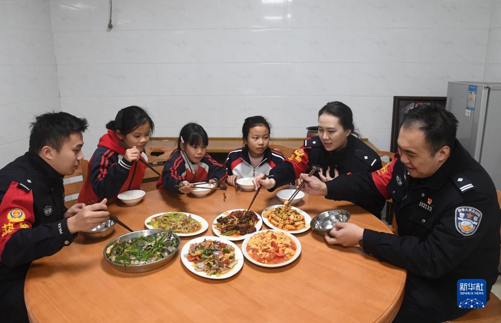 2月5日,南寧鐵路公安局南寧公安處賓陽(yáng)站派出所民警與三姐妹一起吃午飯。家住賓陽(yáng)縣和吉鎮三叉村的呂秀清、呂秀萍和呂秀玲三姐妹,是當地的留守兒童,派出所青年民警志愿者常常利用業(yè)余時(shí)間輔導她們學(xué)習,疏導心理,至今已經(jīng)4年。