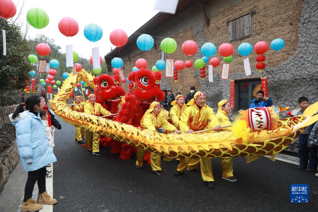 2月5日,在浙江省杭州市臨安區天目山鎮“天目月鄉”村落景區,游客在觀(guān)看舞龍、舞獅表演。