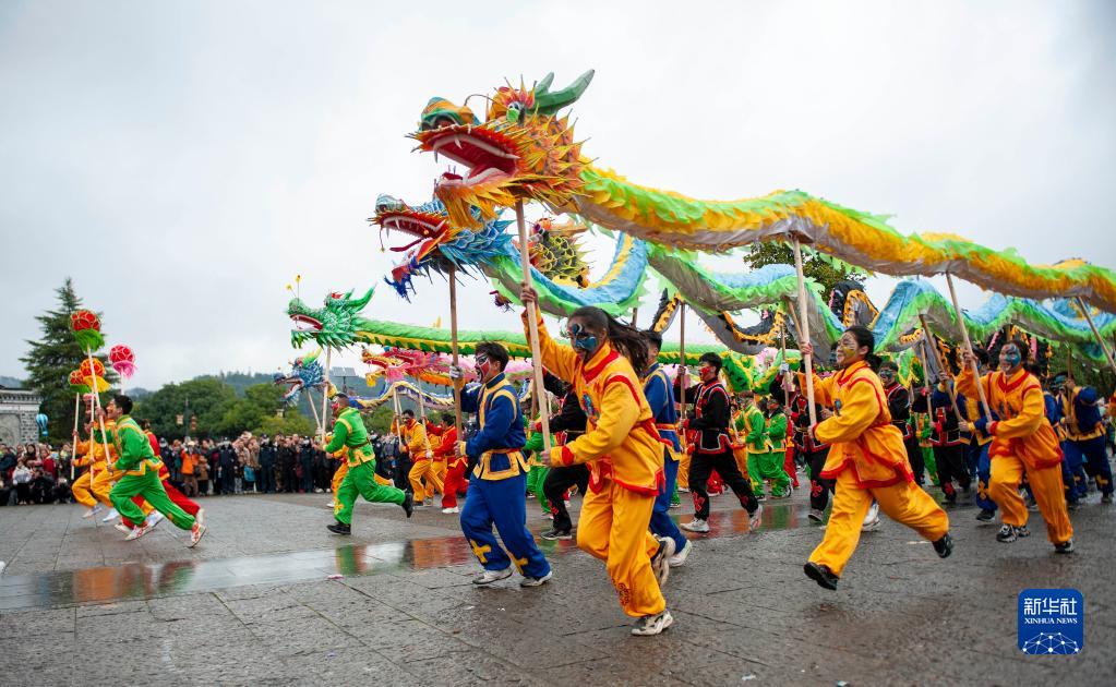 2月5日,貴州省錦屏縣隆里古城的舞龍隊在表演“花臉龍”。