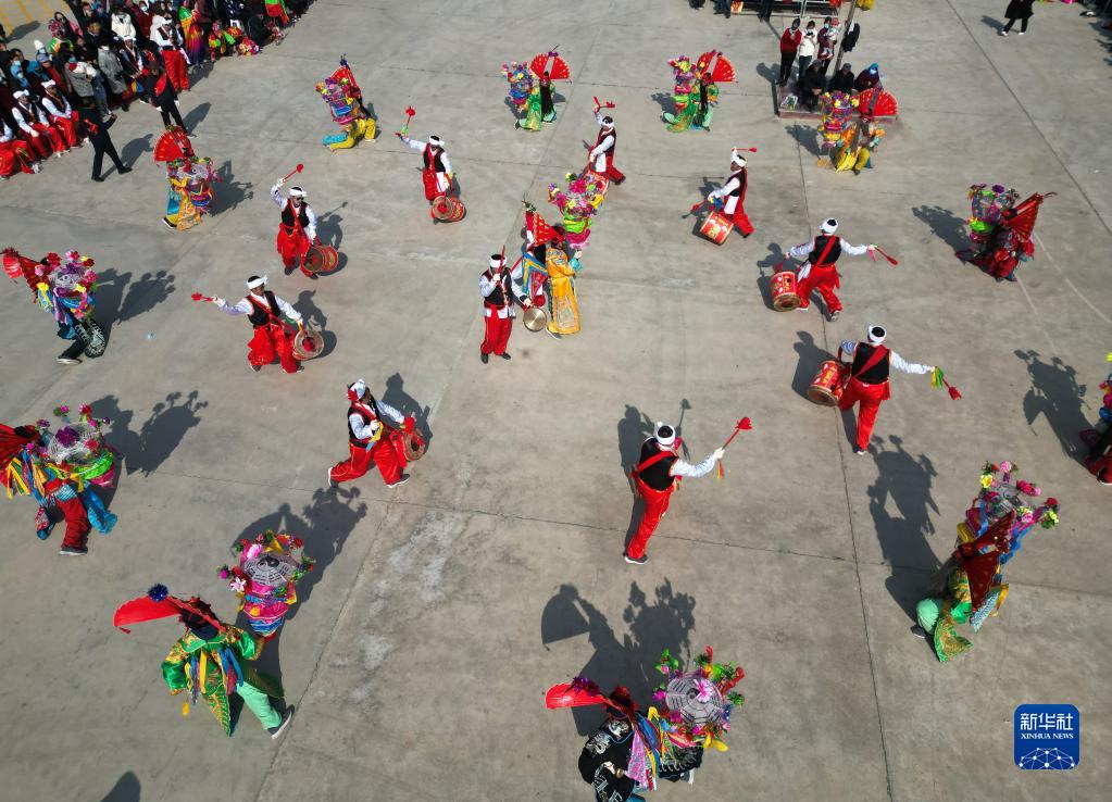 2月5日,在甘肅省永靖縣劉家峽鎮城北新村,鄉村秧歌隊在表演民俗節目“太平鼓舞”。