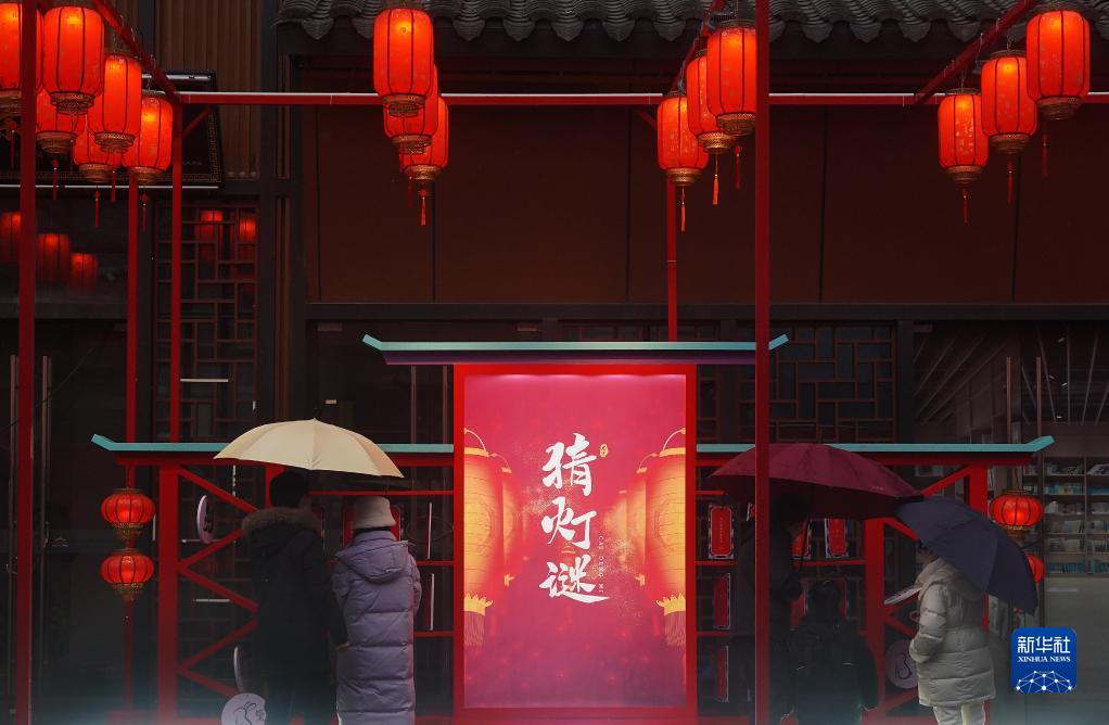 2月5日,游客在南昌市繩金塔歷史文化街區猜燈謎。