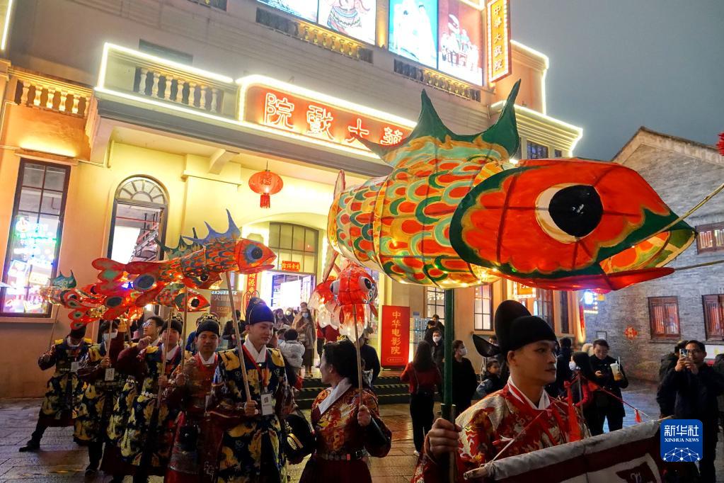 2月5日,在廣西南寧市三街兩巷歷史文化街區,人們手持鯉魚(yú)花燈巡游。