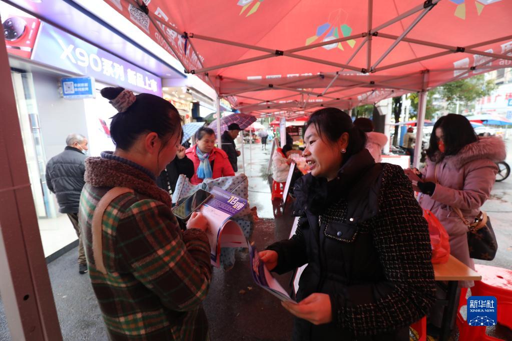 2月5日,在湖南省資興市鯉魚(yú)江片區舉行的2023年“春風(fēng)行動(dòng)”城鎮失業(yè)人員專(zhuān)場(chǎng)招聘會(huì )上,求職者(右)了解就業(yè)信息。